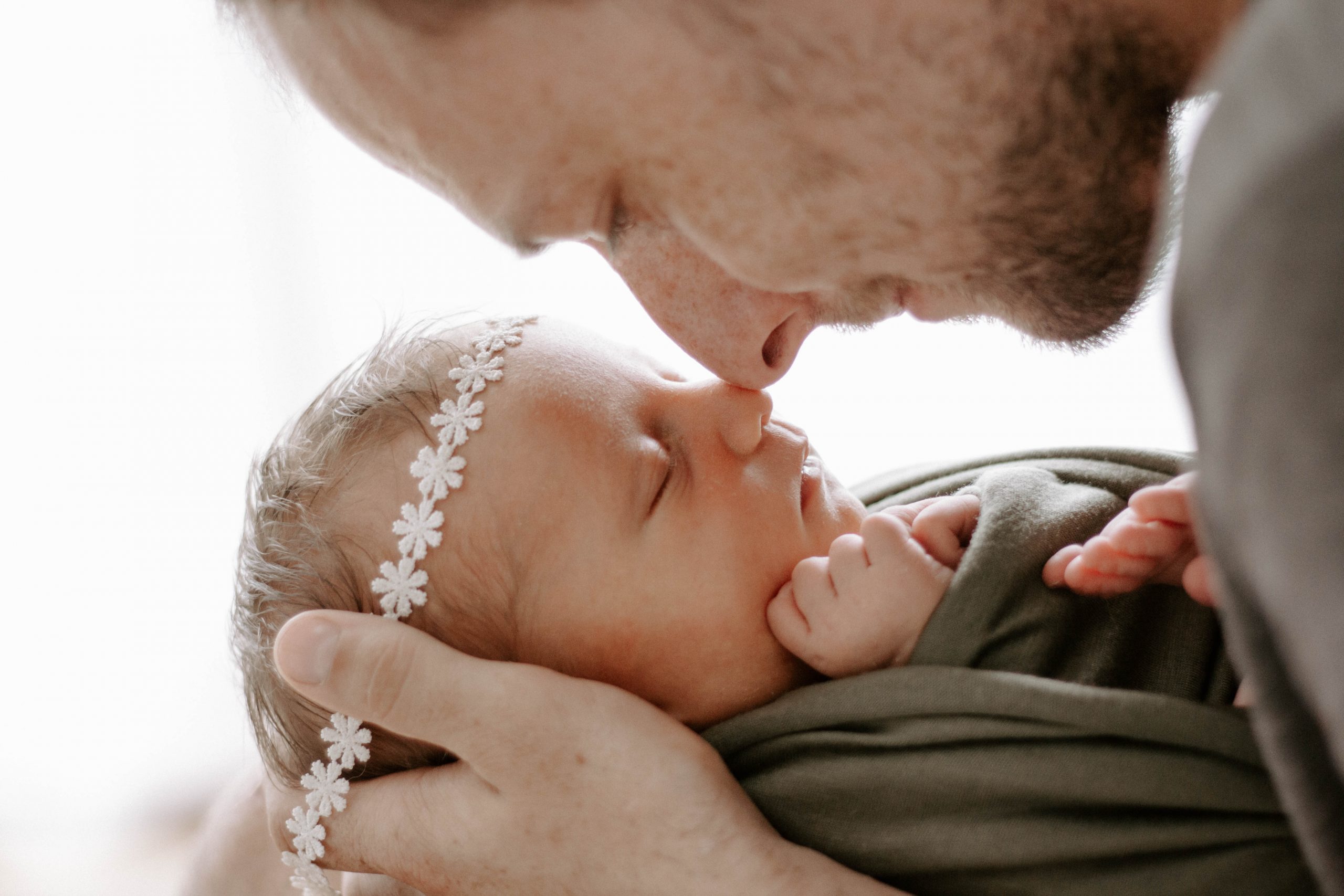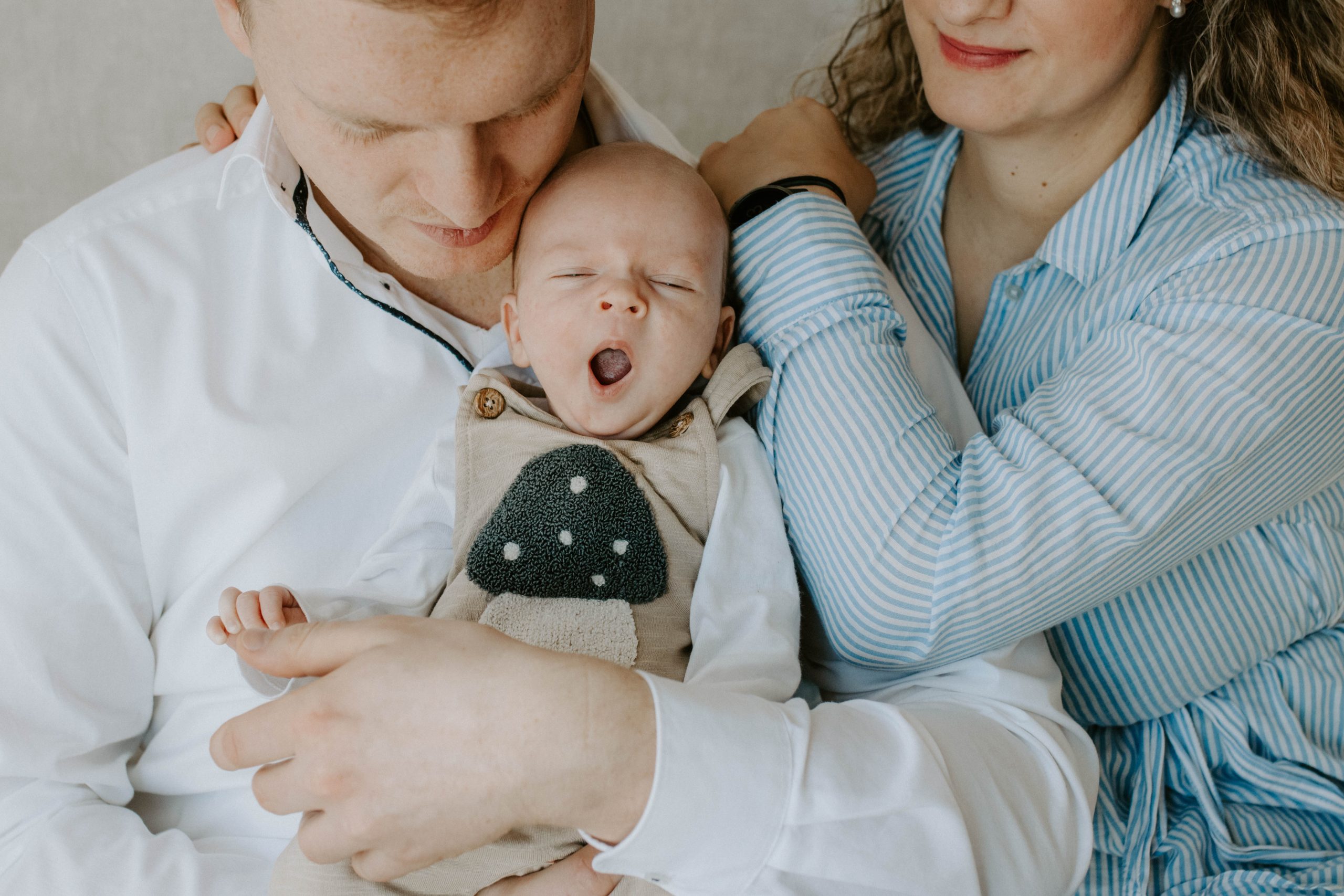 Papa küsst gähnendes Neugeborenes beim Babyshooting im Studio Lüdenscheid